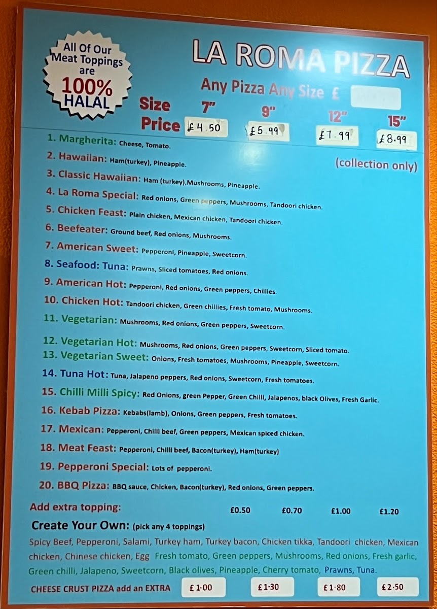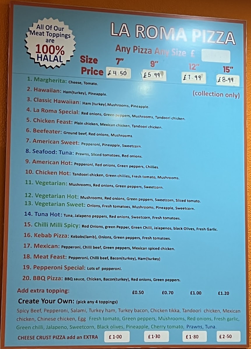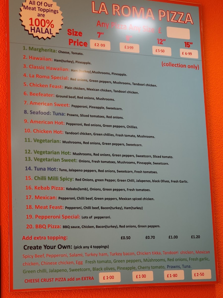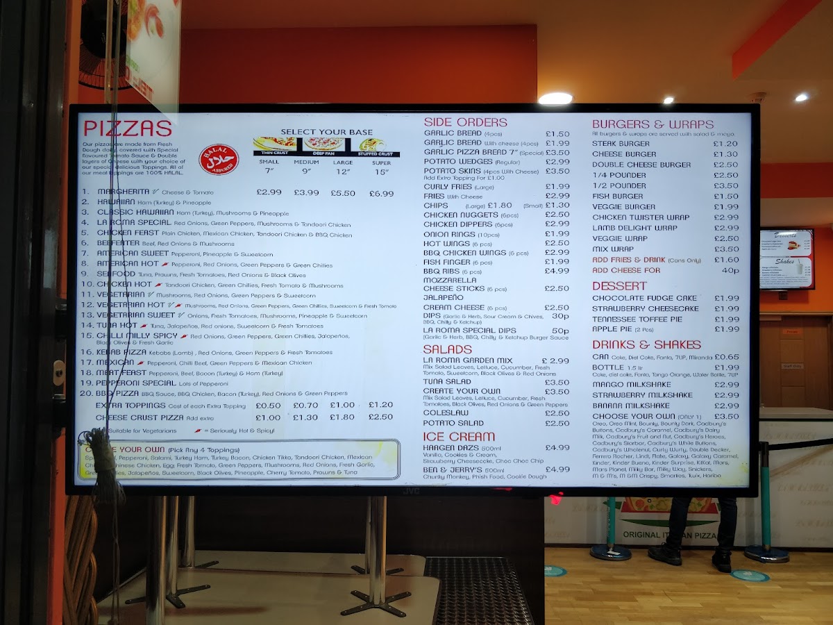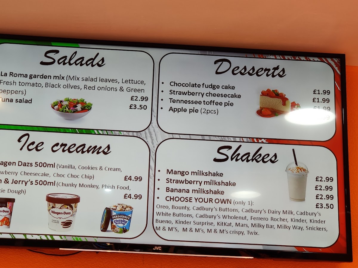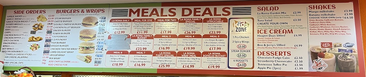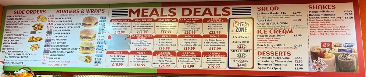 From a reviewer's perspective, the menu at La Roma Pizza UK on 11-21 Clayton Rd, Hayes UB3 1AX offers a versatile mix that caters to both pizza enthusiasts and fast-food lovers. Among the best sellers, the Create Your Own Chocolate Bar Milkshake stands out for dessert lovers, while the classic 12" Margherita and 9" Margherita pizzas deliver simple, satisfying flavors. For those seeking hearty meals, the Zinger Burger Meal and 12" Vegetarian pizza provide filling options. The meal deals are generous and varied, featuring options like the La Roma Boneless Bucket, La Roma Party Special, La Roma Wrap Meal, Meal 3, and Meal 4, allowing diners to combine favorites at good value. Pizza lovers can also enjoy specialty options such as Hawaiian in both 9" and 15" sizes, while burger fans have choices including the Zinger Burger, Tower Burger, and Chicken Fillet Burger, with meal versions that come complete with fries and a drink. Wraps are thoughtfully prepared, served with salad and mayo, with the option to add cheese for 0.40 extra, making them a customizable, lighter alternative. For a fresher option, the salad selection includes Create Your Own, La Roma Garden Mix Salad, and Tuna Salad, offering a balance to the heavier menu items. Overall, the menu successfully combines classic comfort foods with customizable choices, appealing to a wide range of tastes and appetites, making it a reliable spot for casual dining in Hayes.
